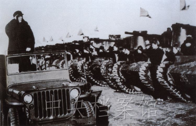 紀錄片:(群眾呼聲)中國人民萬歲?。o錄片解說)檢閱開始了。東北野戰(zhàn)軍參謀長劉亞樓將軍,向毛主席報告受檢閱的部隊全部到齊。坦克塔上飄揚著紅旗,坦克手精神百倍,向著自己的領(lǐng)袖敬禮。